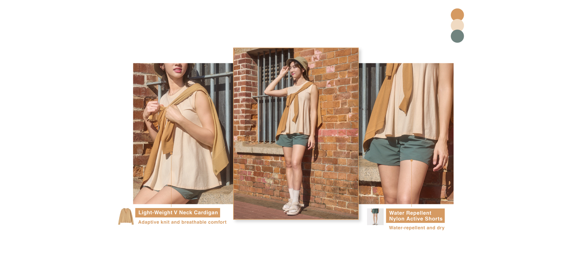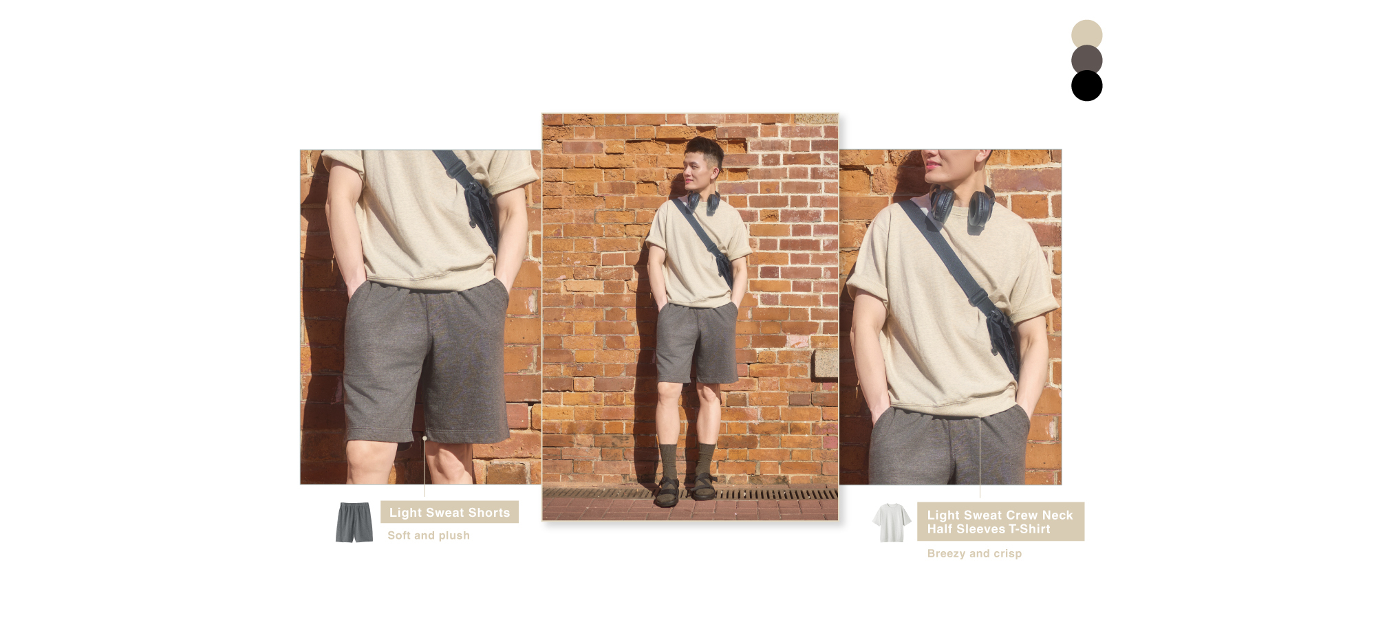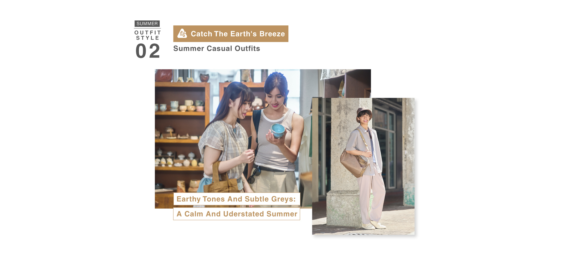 With earth tones and soft greys as the base, the look stays quiet and understated. The natural colors blend gently together, creating a calm and grounded impression. Breathable fabrics and light structures allow air to move easily through each layer, keeping the body comfortable even on warmer days. Simple colors and relaxed materials shape an everyday style that feels clean, effortless, and quietly refined.