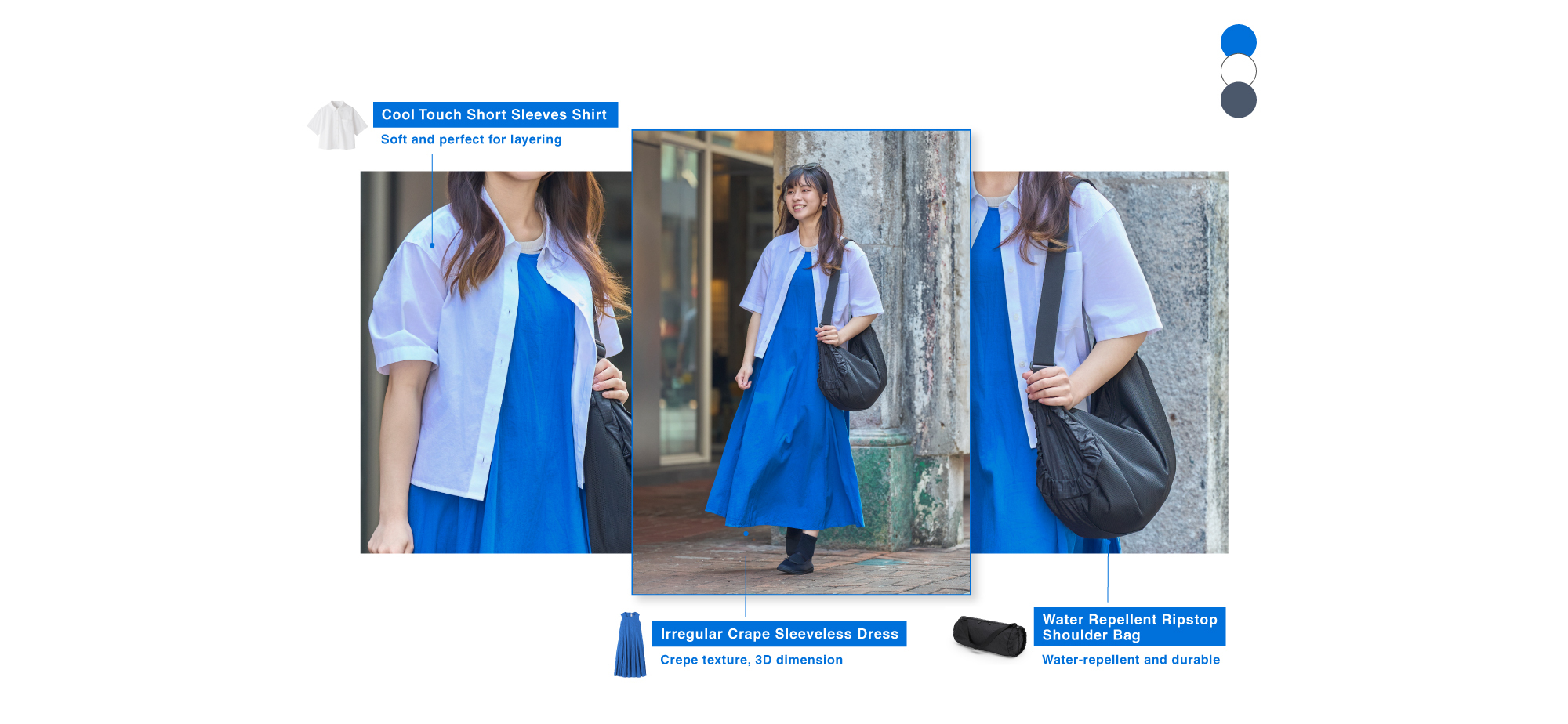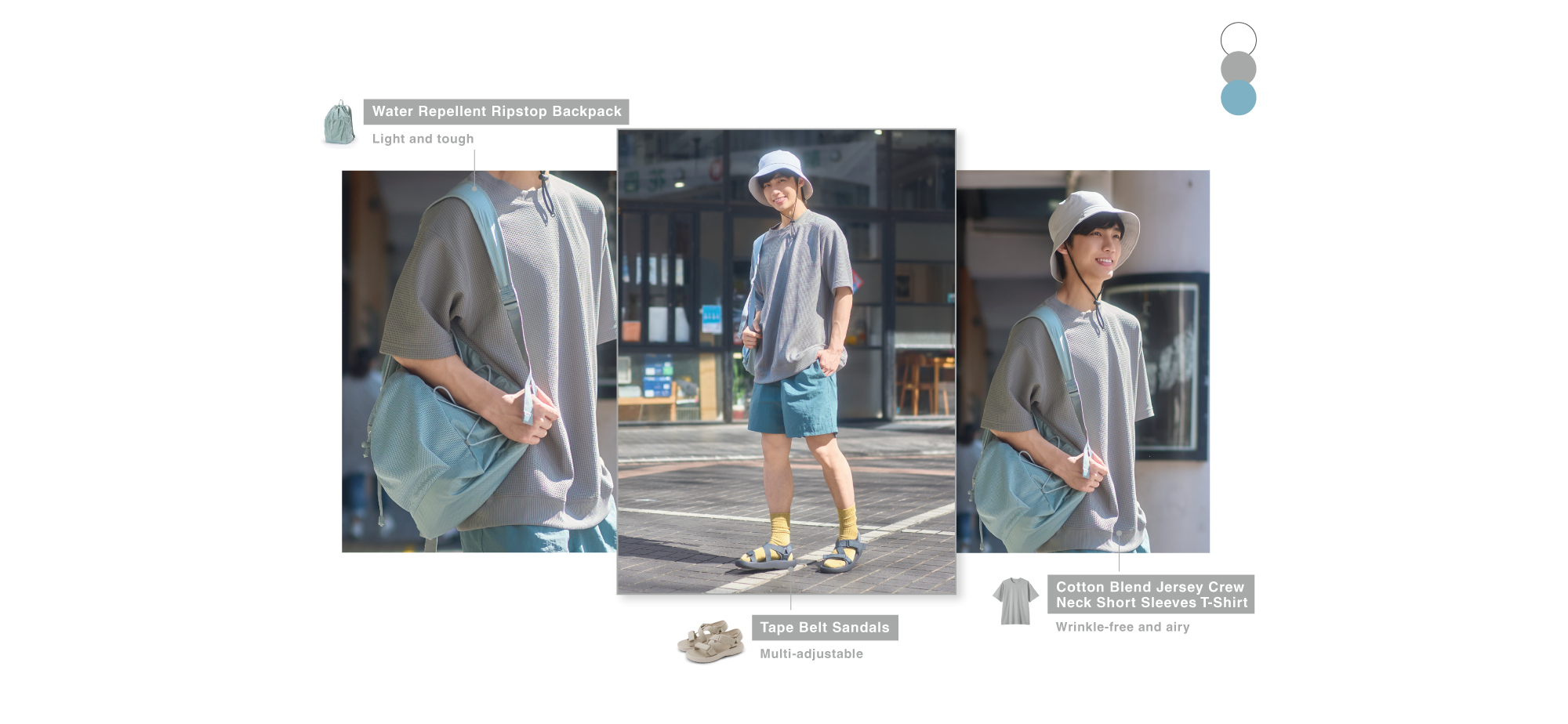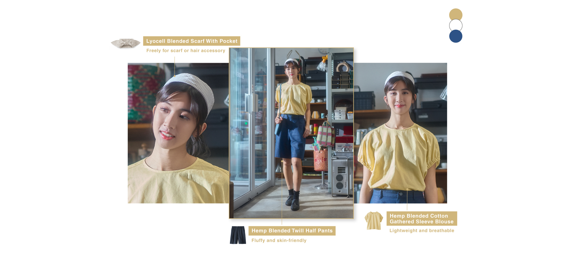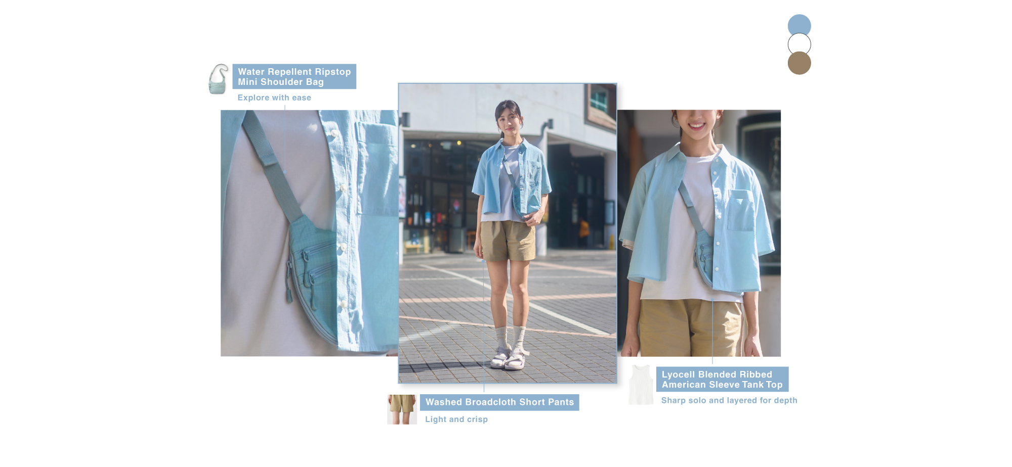 With vivid colors used as gentle accents, the outfit brings a quiet sense of energy to midsummer. Light, breathable materials and airy silhouettes help maintain comfort in warmer weather, allowing the body to move with ease. Simple accessories and a clean, functional bag complete the styling, keeping the overall expression clear and understated. Together, the elements form a bright yet calm summer look, suited to the unhurried rhythm of long, warm days.