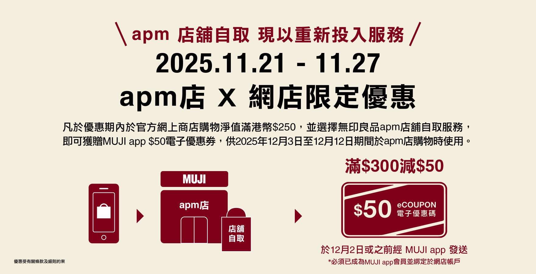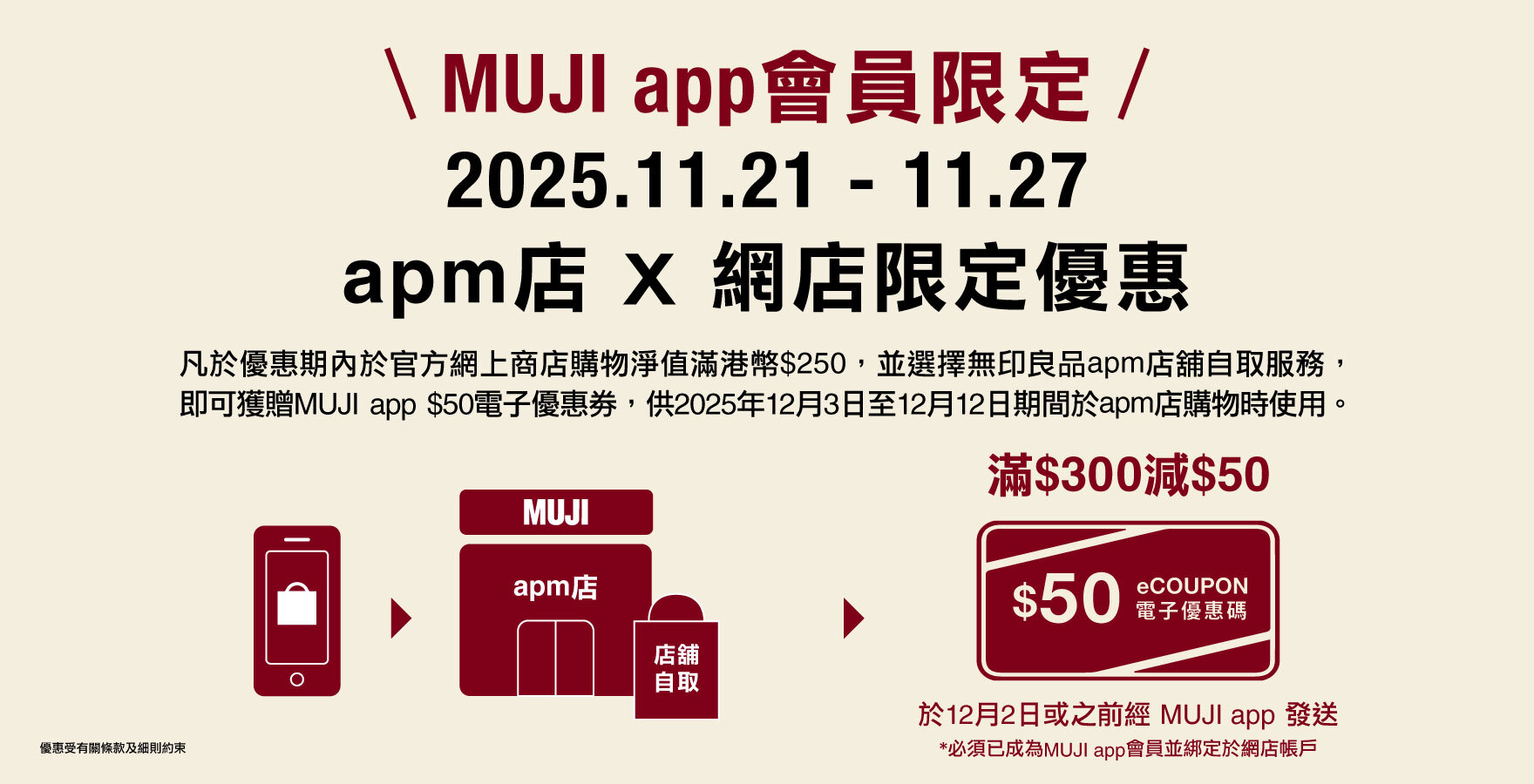 於11月21日至27日於官方網上商店購物淨值滿港幣$250,並選擇無印良品apm廣場店舖自取服務,即可獲贈MUJI app $50電子優惠劵,供2025年12月3日至12月12日期間於apm店購物時使用。