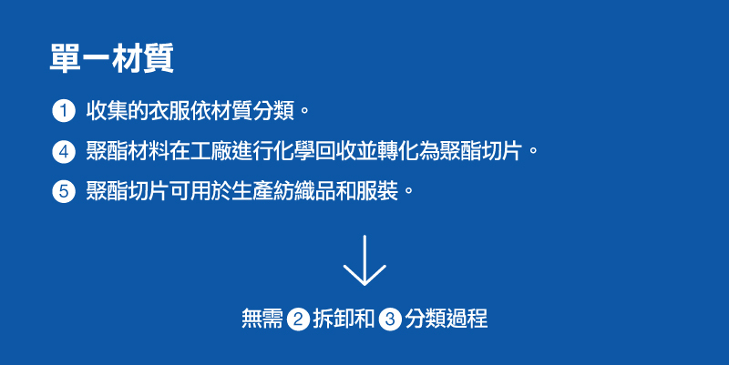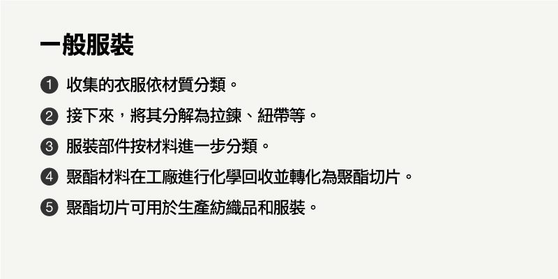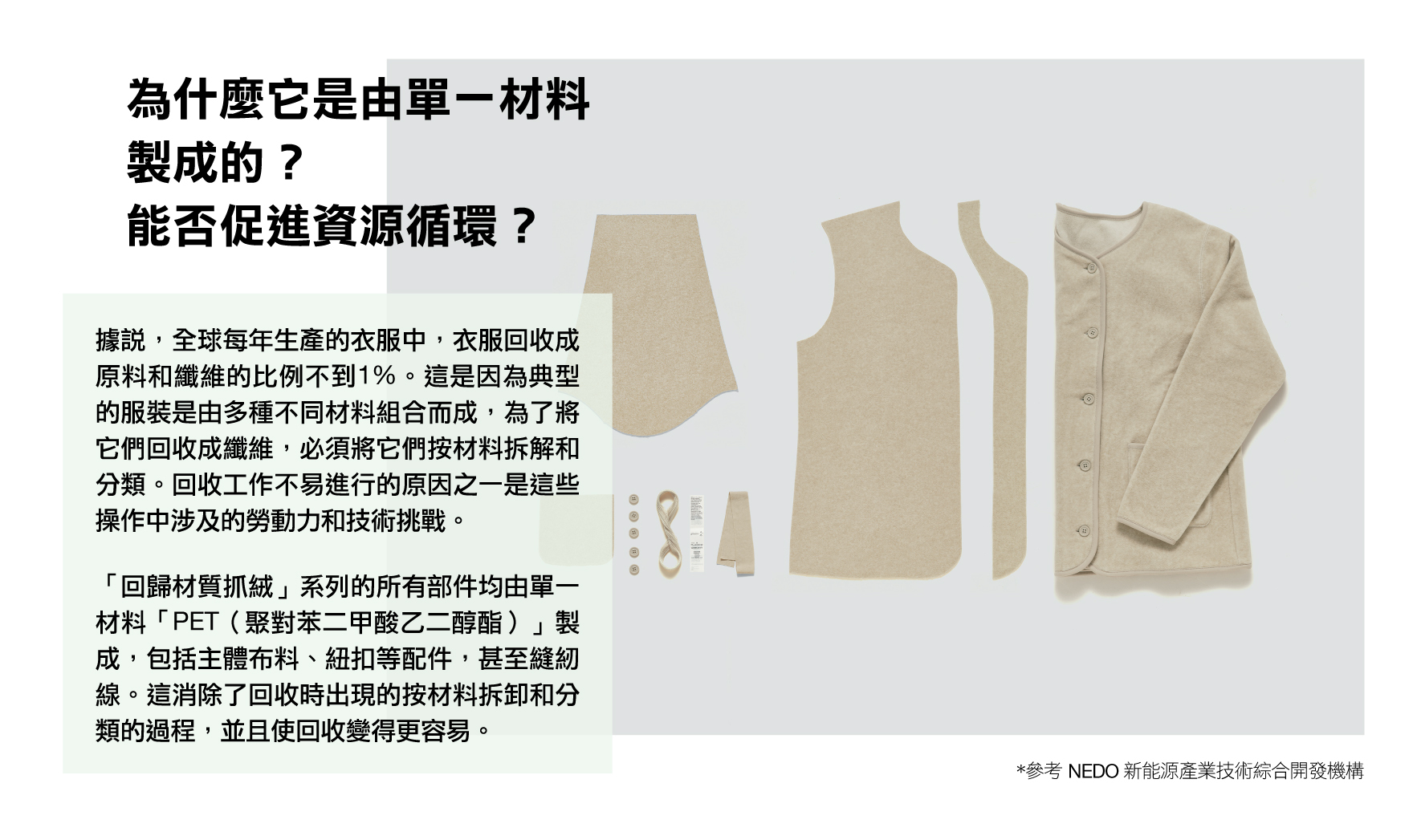 「再生抓毛絨」系列的所有配件,包括主面料、紐扣及縫紉線,均採用單一材料「PET(聚對苯二甲酸乙二醇酯)」製成。