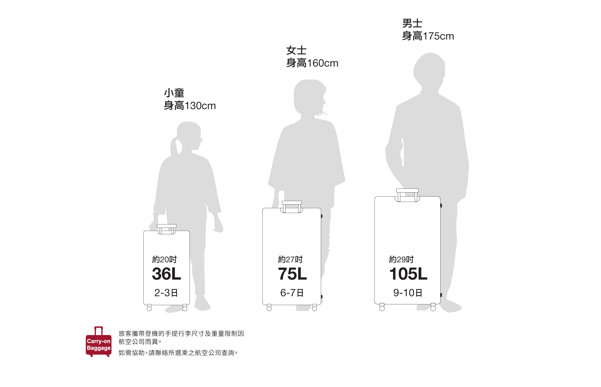 按旅行天數、行李數量和移動方式,選擇尺寸合適的行李箱。