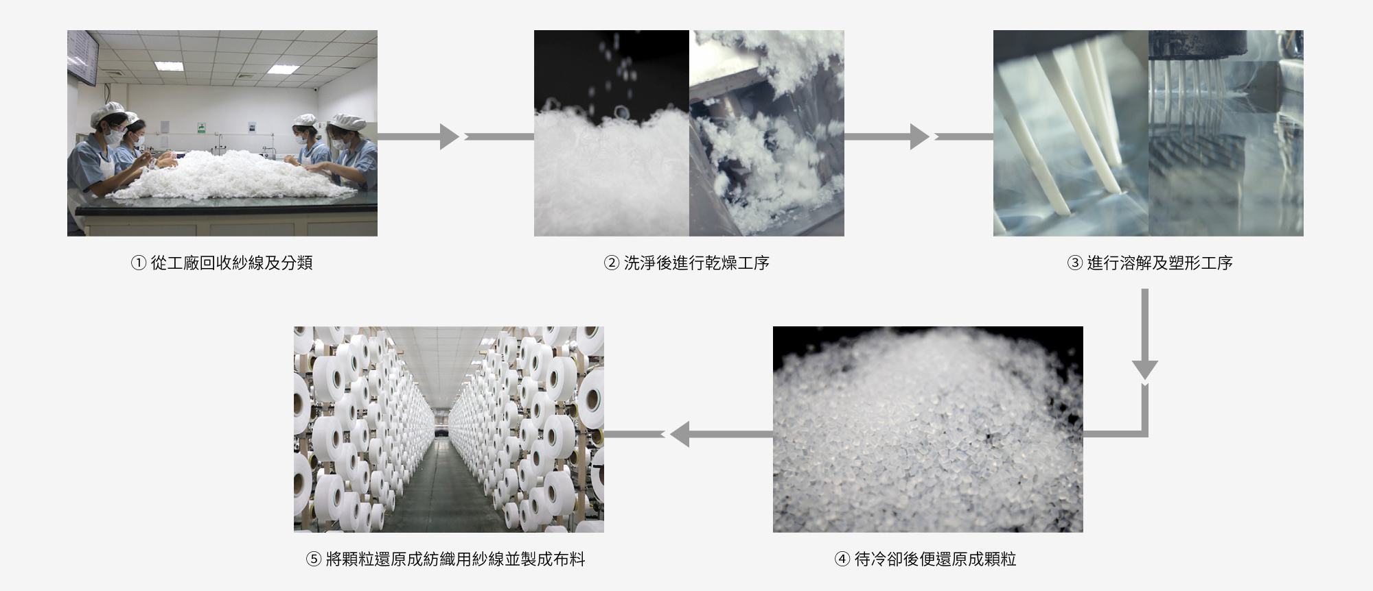 生產過程中剩餘的紗線一般會被棄掉。我們將之回收、洗淨、還原成顆粒,再重新製成紡織用尼龍紗線。為了善用有限資源及減少對環境的影響,我們的輕量便攜式羽絨系列採用再生尼龍布料製成。