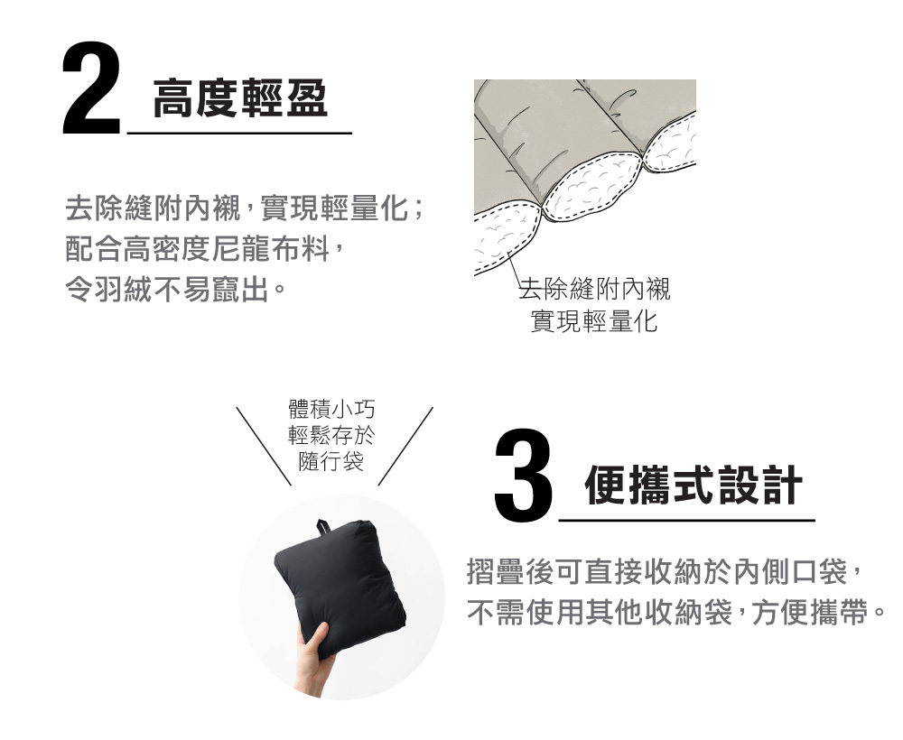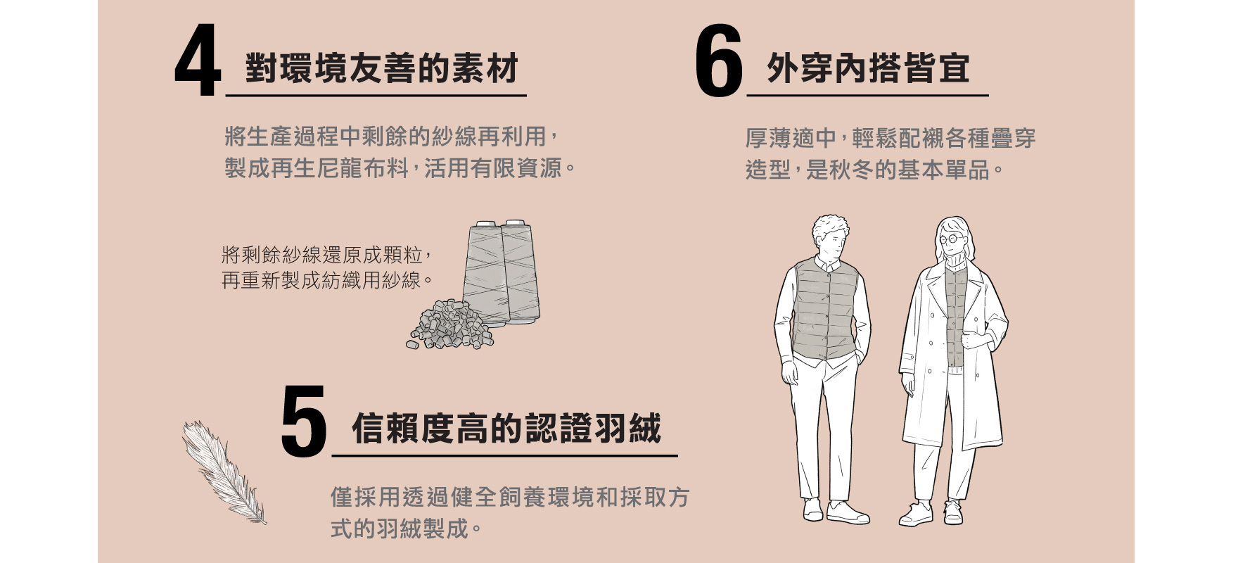 採用對環境友善的再生尼龍為素材,製成全新輕量羽絨服飾系列。