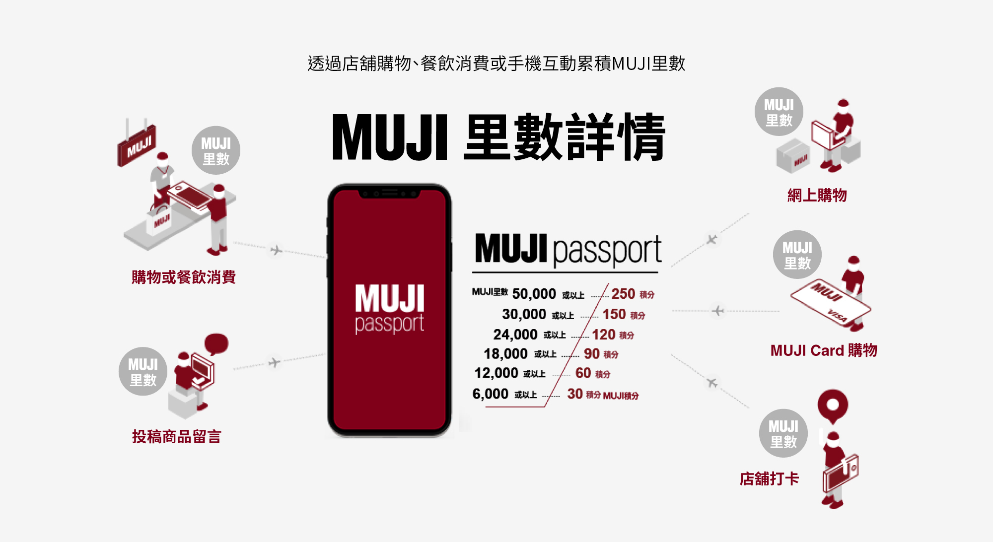 出示 MUJI passport 於香港無印良品店舖消費或透過手機互動,可累積MUJI里數。