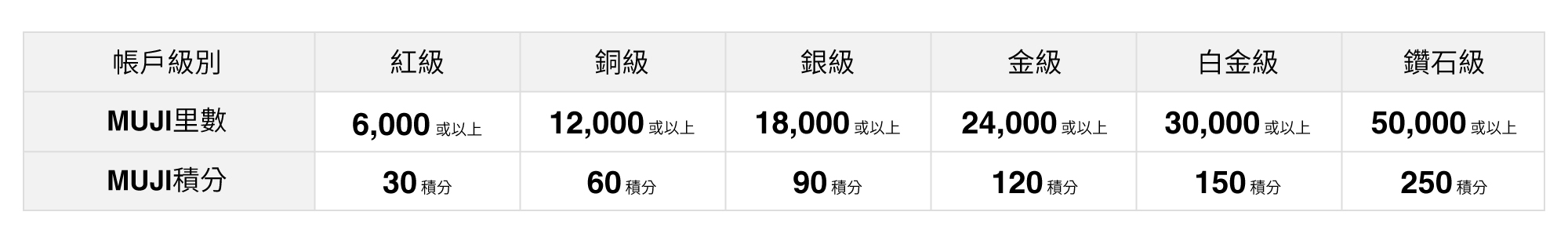 當累積的MUJI里數達到不同級別,即可獲贈相應MUJI積分,於下次消費作現金使用。