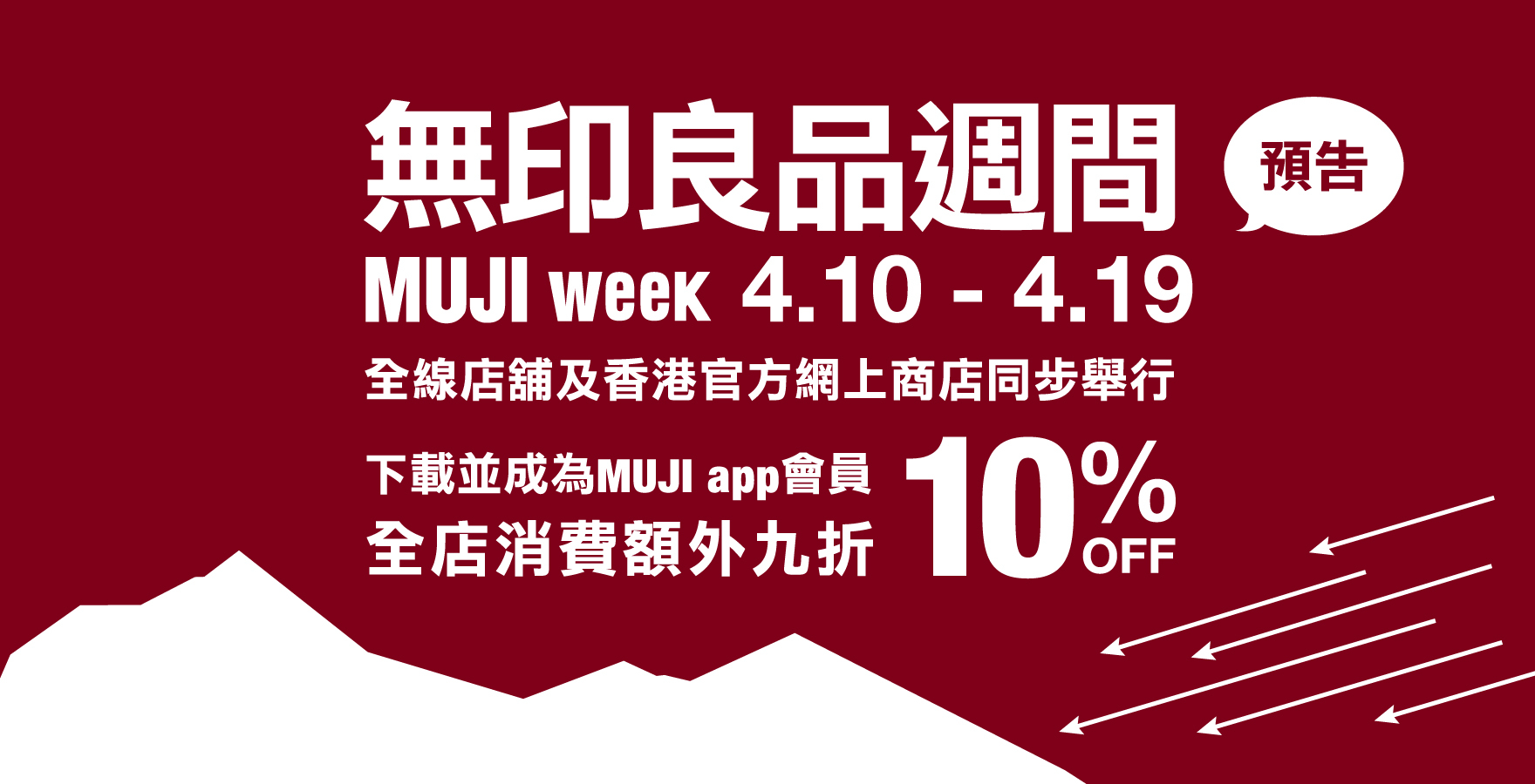 無印良品將於4月10日至19日舉行MUJI Week,下載並成為MUJI app會員,可享全店消費額外九折。