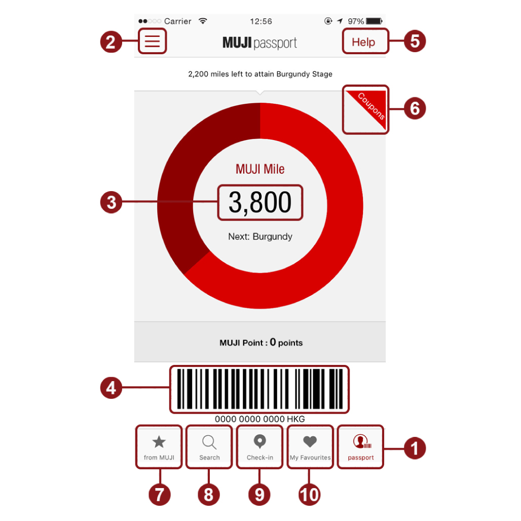 下載 MUJI passport,透過店舖或官方網上商店購物、餐飲消費或手機互動可累積MUJI里數。當累積的MUJI里數達到不同級別,即可獲贈相應MUJI積分,於下次消費時作現金使用。