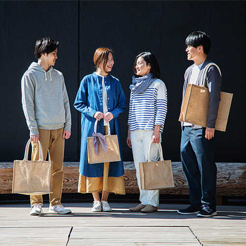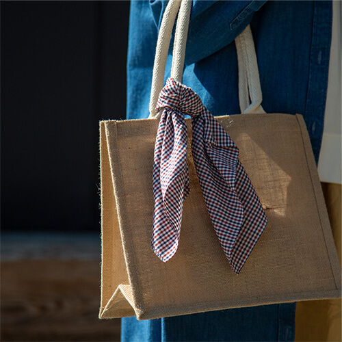 黃麻是一種生長速度快的樹木,播種後3∼4個月即可長到接近3公尺高。 黃麻擁有多種用途製,其製品耐用堅固,在印度自古以來,就常被用來做成穀物袋或墊子。手挽袋採用未經染色的黃麻製成,保留素材自然的樣貌。損耗後可分解和回收,對環境無害。