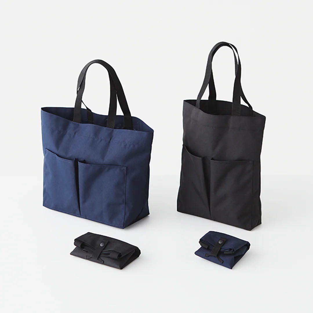 採用撥水加工素材製成,不易沾上水性污垢。為物盡其用,設計上減少裁剪布料,善用資源。可摺疊成小尺寸並以鈕扣固定,方便隨身攜帶。