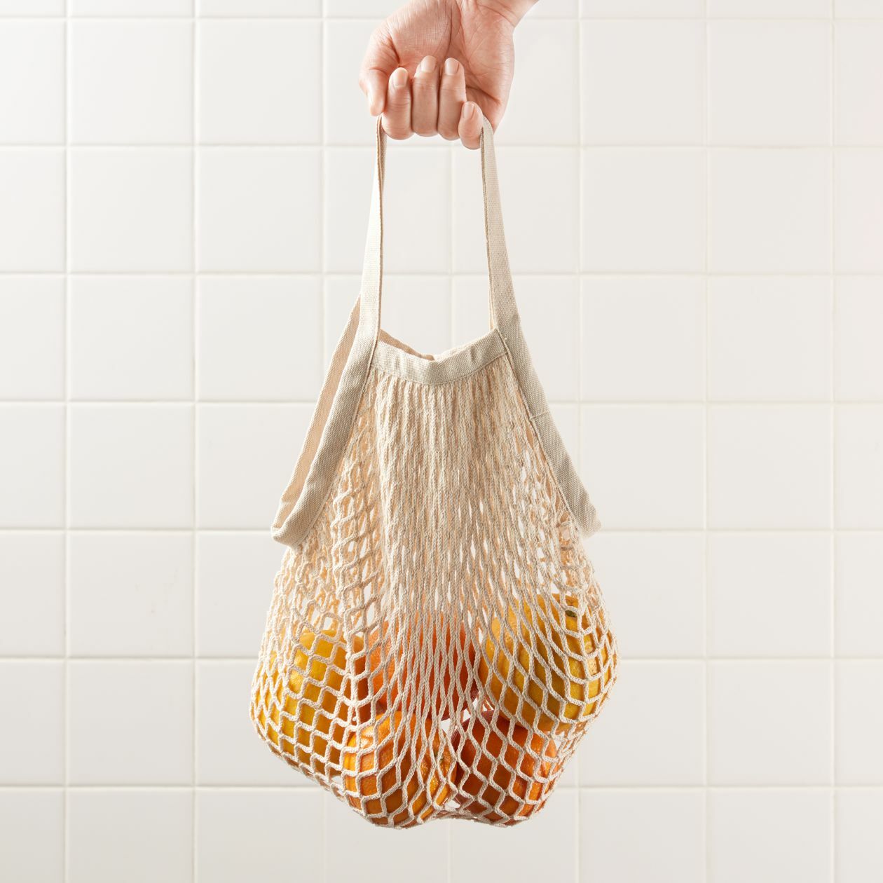 源自法國的傳統購物袋,方便看到內裡物品,採用較粗的棉繩以網狀編織而成,可盛載蔬菜或水果。堅韌耐用,攜帶時可摺疊網袋,減省儲存空間。