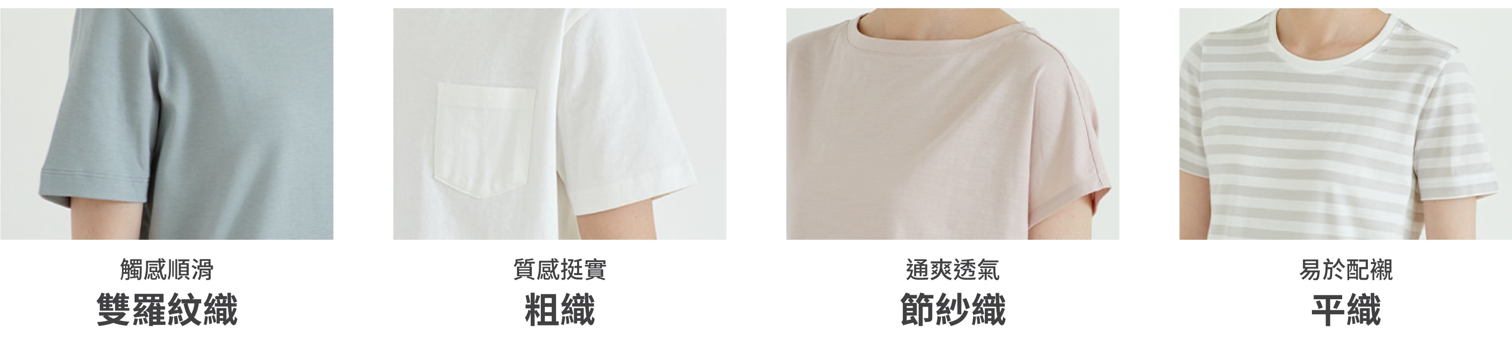 透過不同編織方法,帶來四款剪裁、質感各有特色的T裇, 讓每位穿着者也能挑選喜愛的T裇,享受日常穿搭的樂趣。