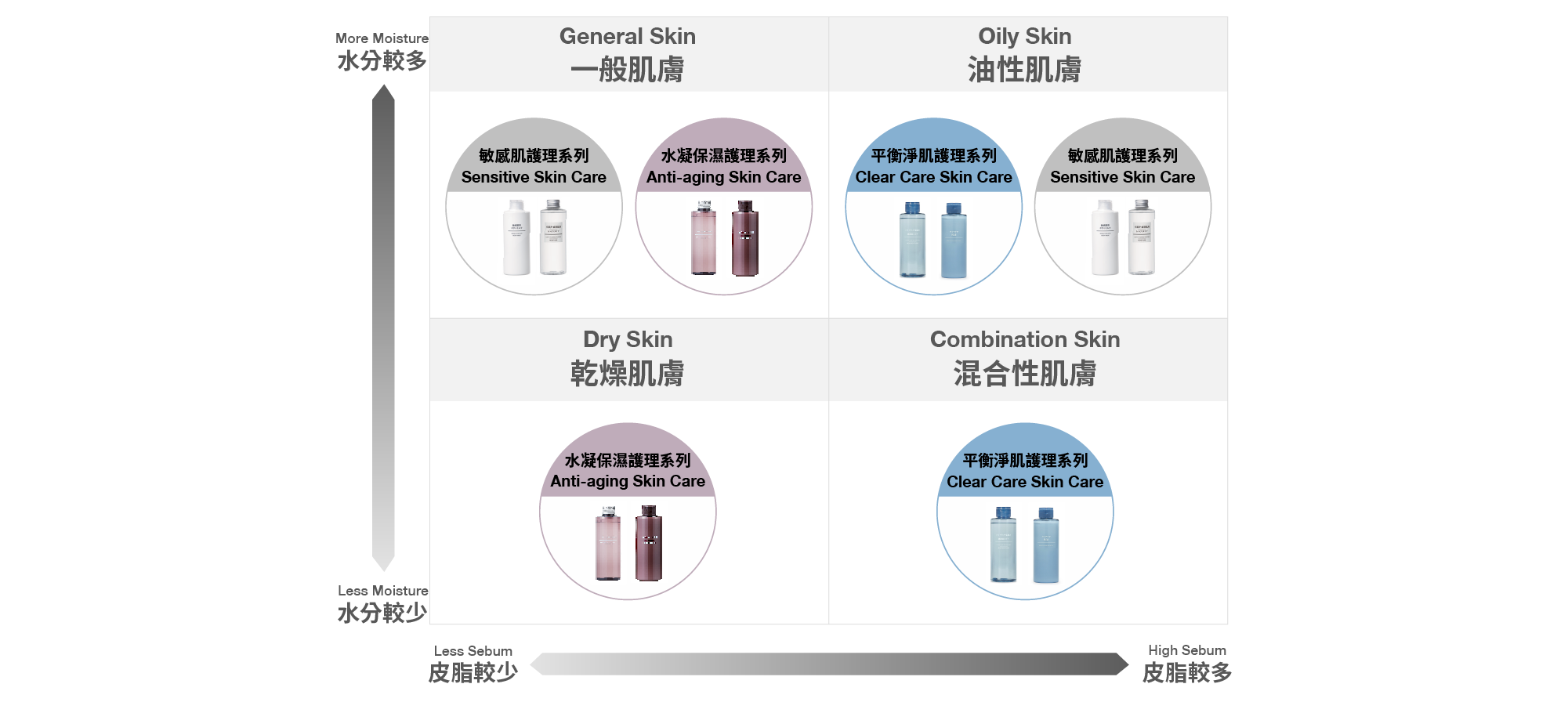 不論年齡及性別,每何人士均能安心使用的低刺激性護理系列。除了用於女士的早晚基本護膚程序,亦適合男士於刮鬍後護理肌膚用。