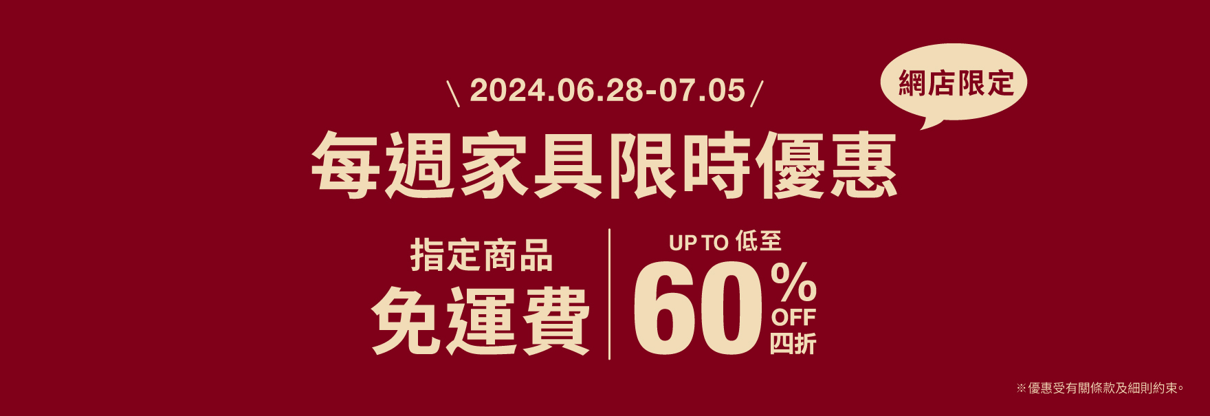 網上商店設立每週限時優惠專區,每週精選指定家具商品,提供即時免運費服務,優惠更低至4折,助你以最優惠價格輕鬆購入良品。