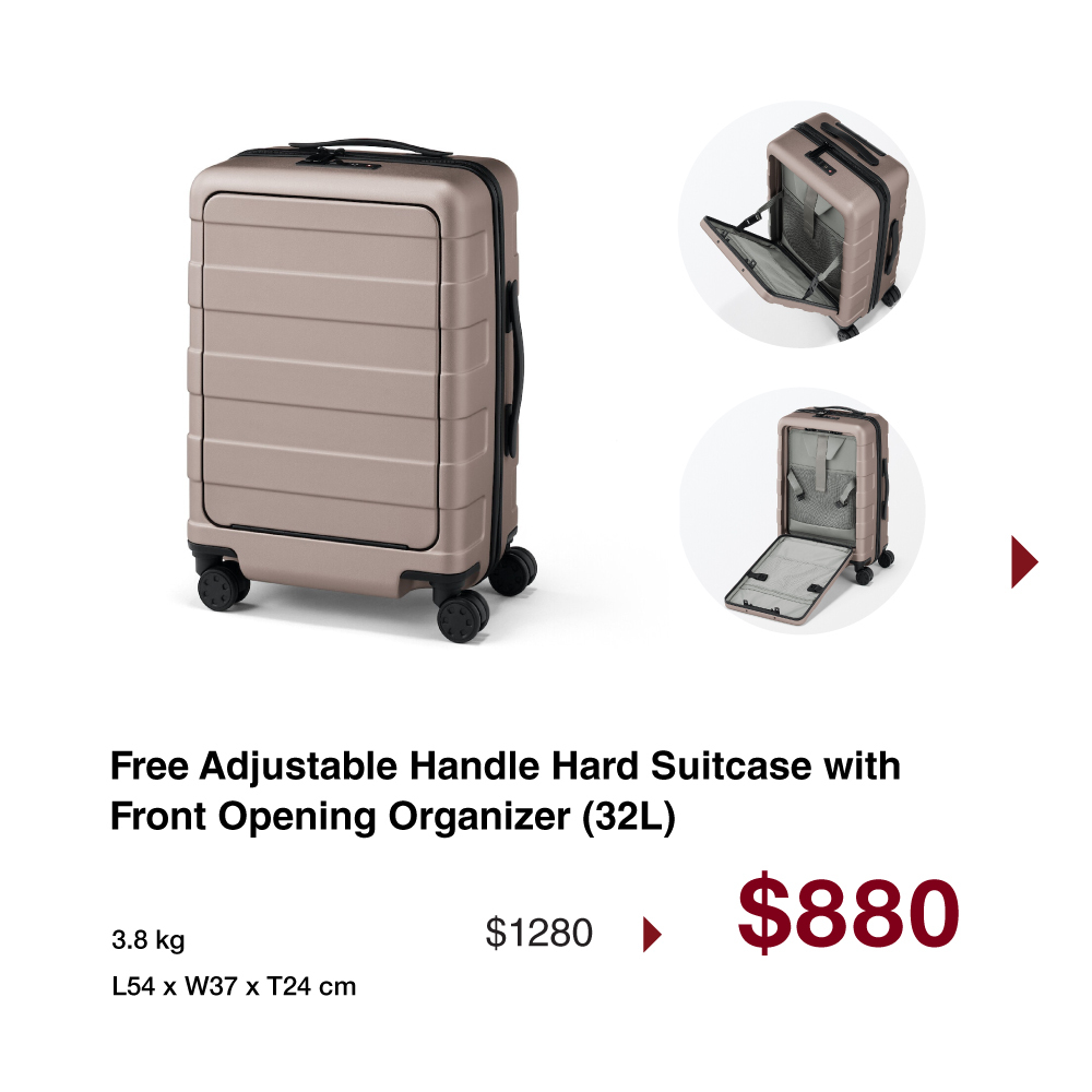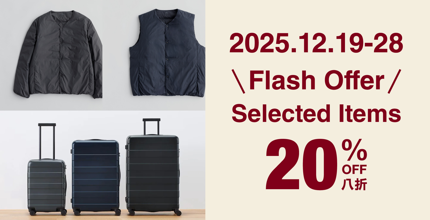 From now till 28th December, enjoy 20% off on Men's/Ladies' lightweight portable down jacket , free adjustable handle hard suitcase and water repellent Sacoche. Available while stock lasts.