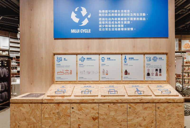 「MUJI CYCLE」資源再生回收箱鼓勵顧客參與循環經濟,將清潔乾淨的塑膠、鋁罐、紙張及玻璃帶到店內,投放於相對應的回收箱。這些回收物料將經過專業處理,轉化為全新的生活用品,減少浪費。