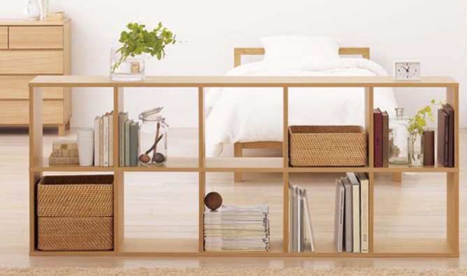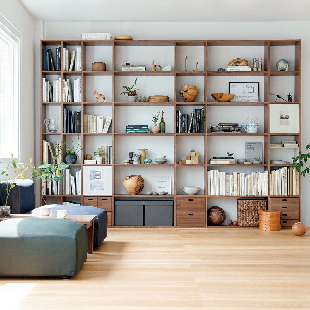 木製層架的組合套裝。無印良品的收納用品可以完美配合開闊的空間。